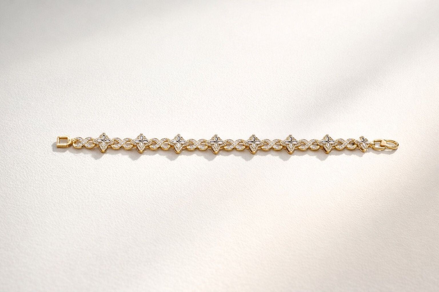 Pulsera elegante en tono dorado con diseño continuo de flores estilizadas. Cada motivo floral está delicadamente decorado con pequeños destellos brillantes que se combinan con eslabones entrelazados también adornados, creando un efecto luminoso y sofisticado a lo largo de toda la pieza.